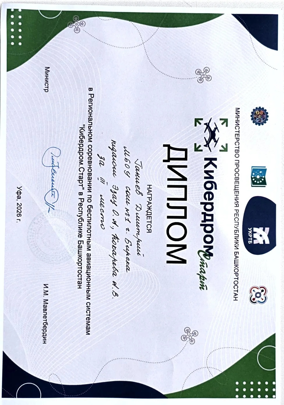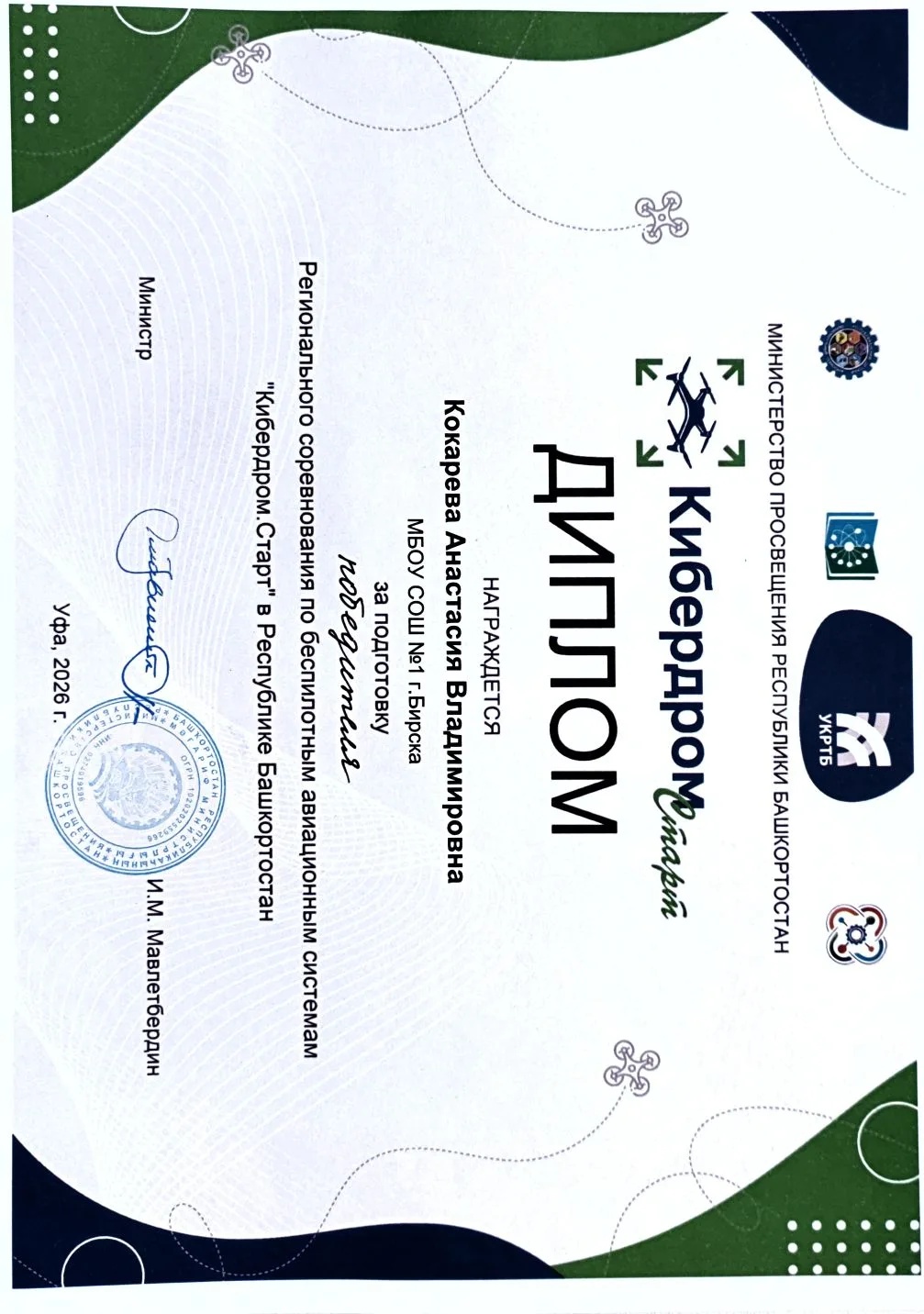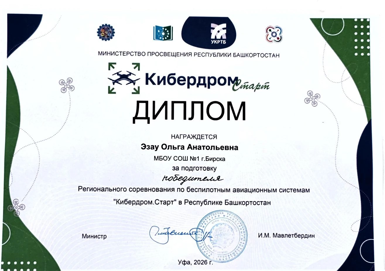 2 апреля 2026 года команда обучающихся МБОУ СОШ № 1 г. Бирска под руководством педагогов-наставников А. В. Кокаревой и О. А. Эзау приняла участие в Региональном этапе соревнований по беспилотным авиационным системам «Кибердром.Старт» в Республике Башкортостан.